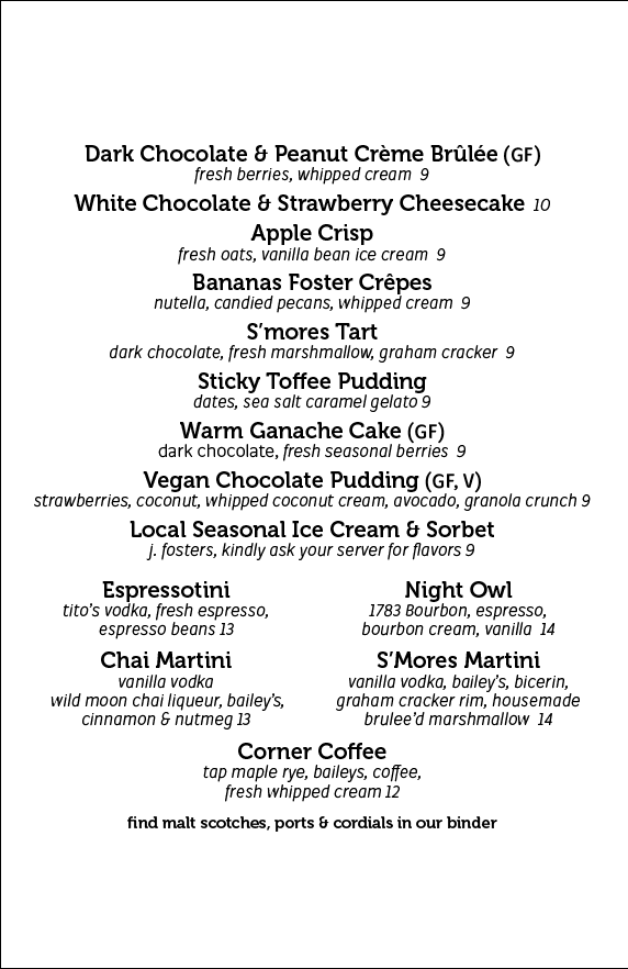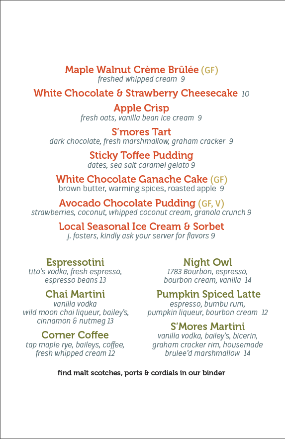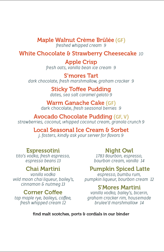 Like our main menu offerings our desserts change seasonally, and are all made in house by scratch.